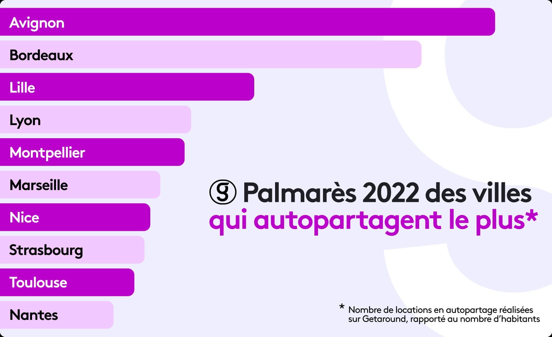 *Ce classement a été établi en calculant le nombre de locations de véhicules en autopartage effectués sur la plateforme Getaround, rapporté au nombre d’habitants. Nous avons exclu volontairement Paris afin d’éviter des données biaisées par la taille des villes.