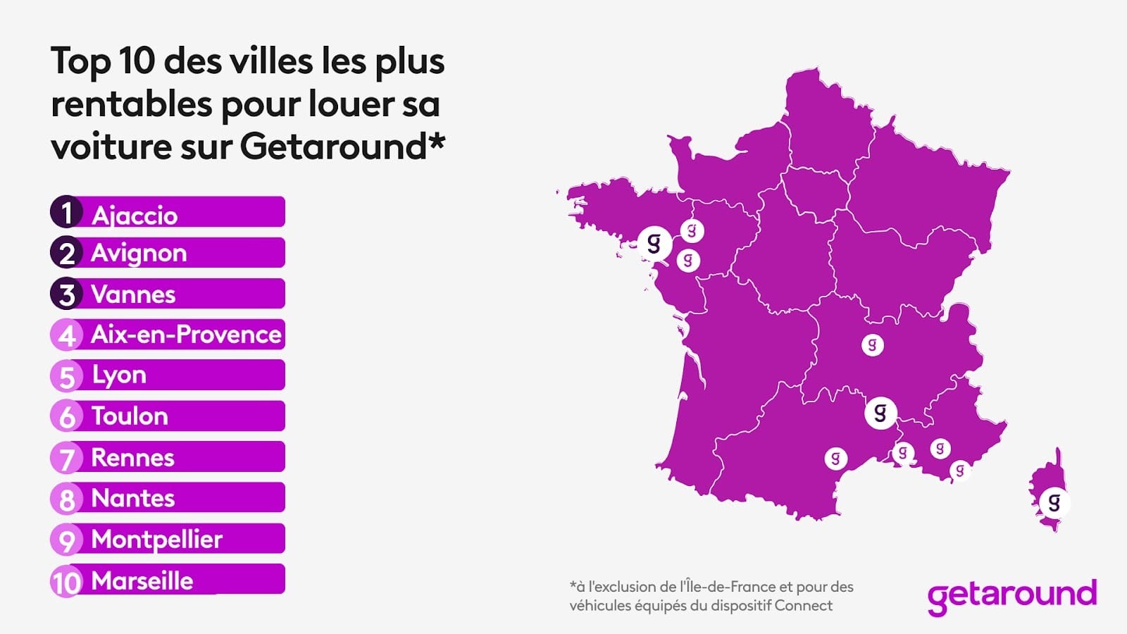 Getaround a réalisé un classement des 10 villes en France où louer sa voiture rapporte le plus** :